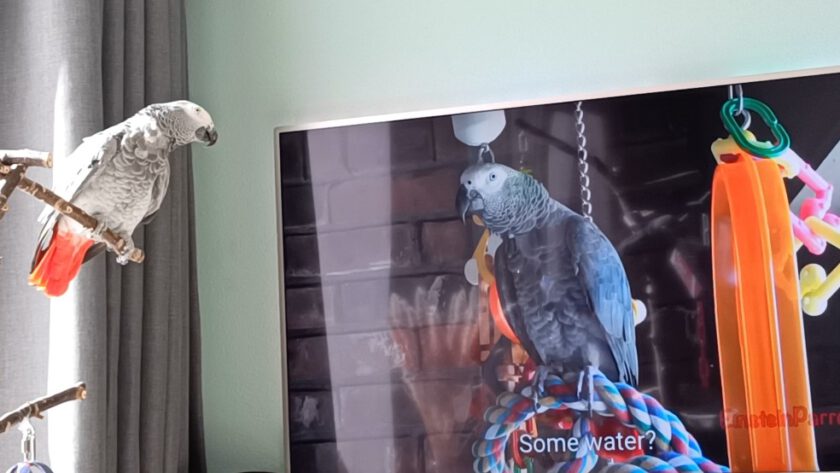 Ondertussen zet ik de tv voor haar aan. Ja… echt. Natuurlijk niet met Dora of een ander tekenfilmpje, maar met de grijze roodstaart Einstein of Petra of welke andere dansende vogel haar die ochtend kan beroeren. Hilarisch! Zo speelt ze tot ze aangeeft weer naar haar kooi te willen en ik haar terugbreng naar haar huisje. Daar gaat ze weer over op de orde van, een voor haar normale dag. Een normale dag van vóór de tijd dat ze haar veren plukte.