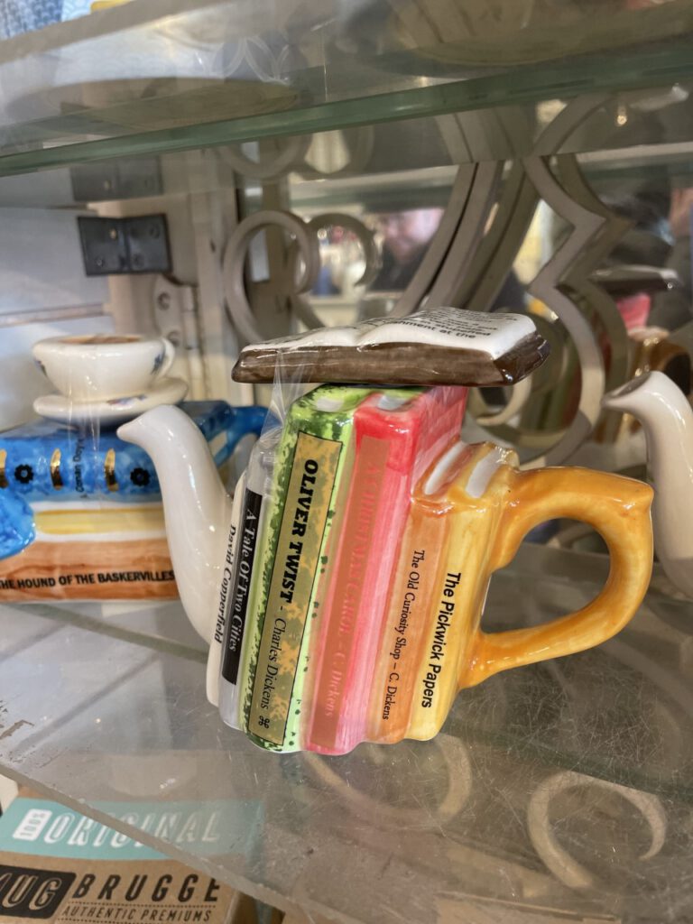 Met een patissier in de dop, konden we natuurlijk de vele chocolade winkels niet zomaar voorbij lopen. Zelf ben ik niet een hele grote chocolade liefhebber, maar wat een prachtige dingen kunnen sommige mensen daarmee maken. Daarna kwamen we langs een antiekwinkel met in de etalage enorme boeken, die je zéker niet bij Kobo of de reguliere boekhandel zult vinden. Een andere winkel waar ik hélemaal gelukkig van werd, was een theewinkel. Manou zag in een etalage aan de overkant een geweldige collectie theepotten en bekers staan, dus daar moesten we een kijkje nemen. Binnen leek het meer een theepotten museum. Echt geweldig! Wist je dat er een Jane Austin theepot is? Of een Charles Dickens theepot? Nee? Nou ik ook niet, tot dat moment. Met uiterste voorzichtigheid, draaide Manou het potje om, om aan de onderkant de prijs te checken. Iets wat ik trouwens nog steeds een beetje dom vind. Waarom zit bij zoiets breekbaars, de prijs aan de onderkant? Waarom iedereen die overweegt om zo’n item te kopen, het ding op laten pakken? En dan ook nog om laten draaien… Besef dat die pot €145,00 kostte. Je zou het ding bijna van schrik op de grond laten kletteren. Maar goed… na deze constatering, heeft ze de pot met uiterste precisie terug op zijn plekje gezet. Dit bedrag vond ik een beetje te veel van het goede. Wel kon ik de FlowerPower thee niet laten staan. Ik werd helemaal blij toen ik zag dat ze een thee naar mijn boek vernoemd hebben. (Ssst… Niks zeggen. Laat me lekker in die waan). Hoe dan ook… We waren er voor een rondleiding. Dus na een heerlijke lunch moesten we alweer richting de auto.